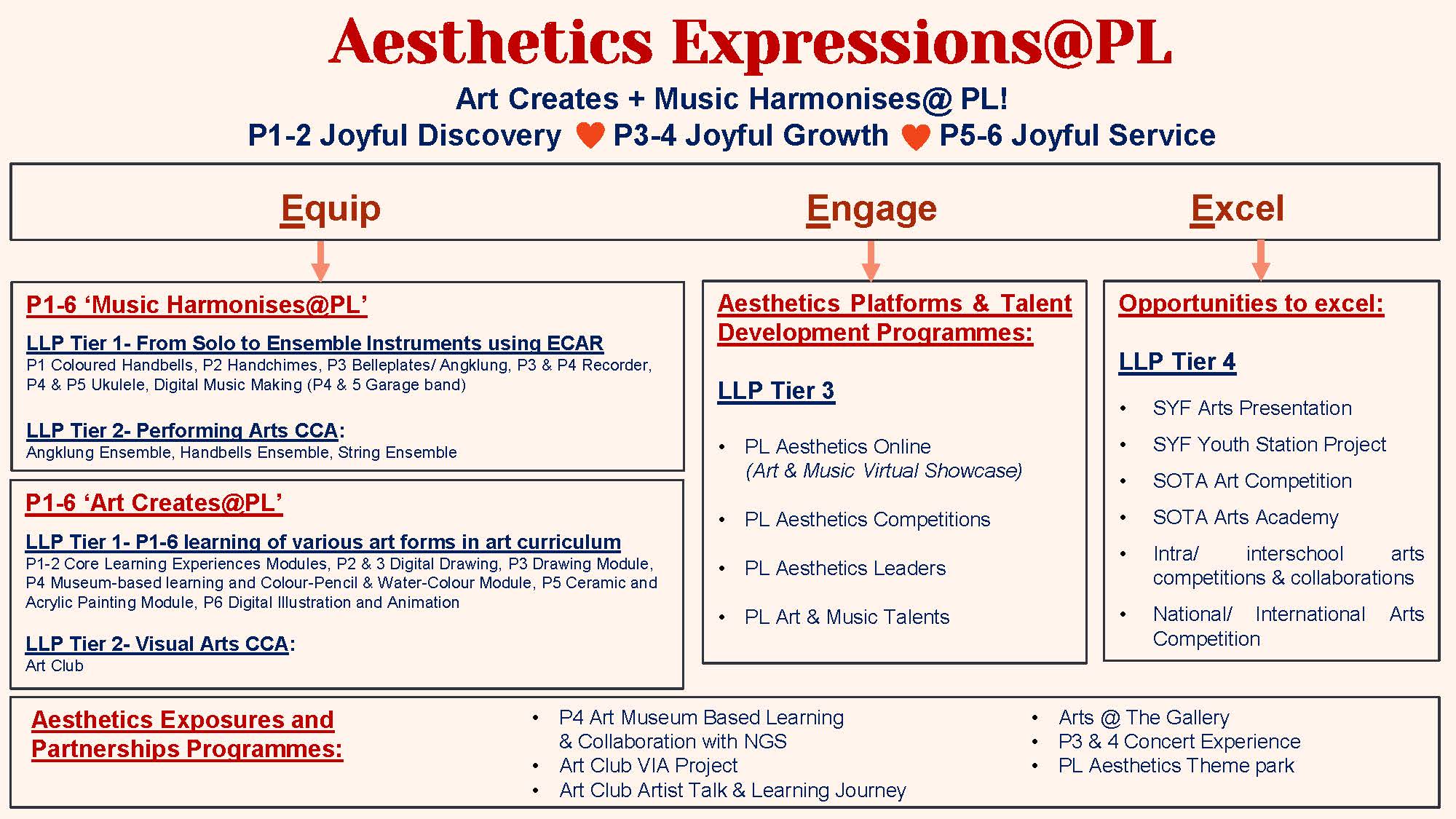 Our LLP programme aims to provide a holistic aesthetics learning experiences for our PL-lites through _‘Music Harmonises@PL’_ and _‘Arts Creates@PL’_. We envision our PL-Lites to be well-exposed and equipped with various forms of music and art making skills learnt throughout P1-6. Through our Music & Art programmes and curriculum, our LLP plan also aims to develop our PL-Lites in terms of aesthetics appreciation skills and readiness for the digital age. In Music, they will be learning of different instruments, digital music making and in Art, they will be learning various 2D &3D Art forms and digital art making.