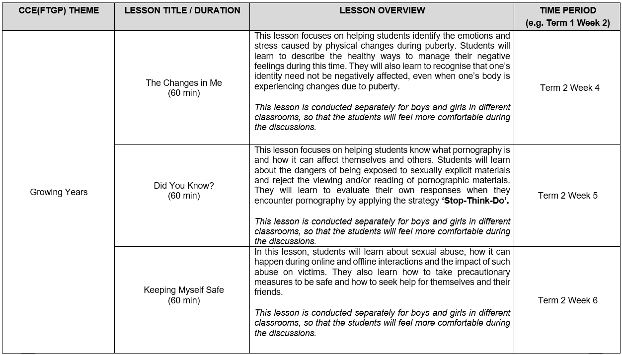 At Paya Lebar Methodist Girls’ School (Primary), the following Sexuality Education lessons will be taught in 2026: